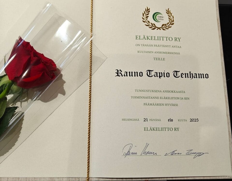Rauno Tenhamolle on myönnetty 21.08.2025 Eläkeliiton kultainen ansiomerkki tunnustuksena ansiokkaasta toiminnasta Eläkeliiton ja sen päämäärien hyväksi. Onnittelut Raunolle!